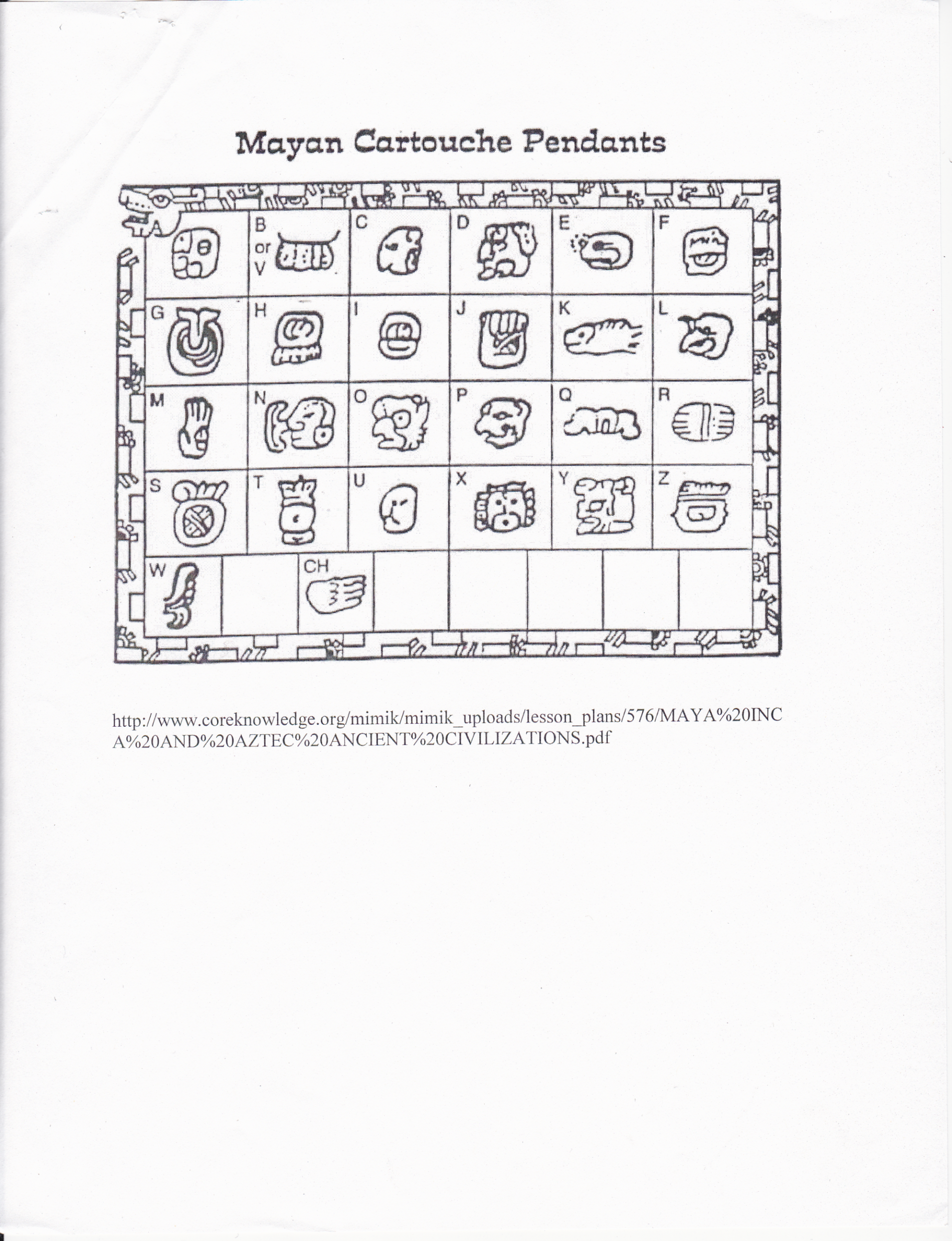 Direct instruction 15 min- Students will be introduced to the Mayan Alphabet and brainstorm their ideas and curiosities in groups. Teacher will present a model of her Mayan name and how it is deciphered into Mayan hieroglyphics.