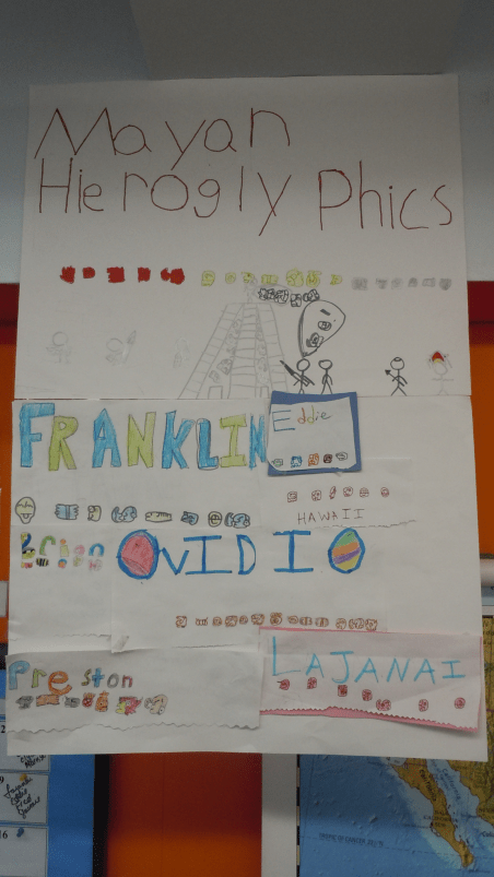 Work Time 20 min- Students go back to their desks to work independently. Using resources and the Mayan Alphabet Handout, students will create and design their own names using Mayan glyphs.